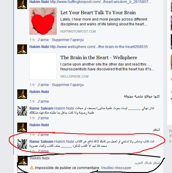 وبلغة الواثق من نفسه تحداني ان اتي بدليل عن ذلك وبلغة المطمئن حذرني انني ان لم اتي بدليل بحثي علمي فسينذرني هو الان واثق انني لن اتي بدليل علمي لانه ليس موجود لانه يظن ان القلب مجرد مضخة للدم ومدام القران قال ان القلب يفكر ويعقل وله ذاكرة فهذا يعني بمفهومه ان القران خرافة بشر ولن يكون حقيقة علمية ابدا وسيعطيني انذار ليبرهن للاعضاء انه انتصرثم اتت البراهين والبحوث والدراسات الاكتشافت العلمية تبرهن ان القلب فعلا يفكر وله عقل صغير يتكون من 400الف خلية وله ذاكرة وتردادات يعني بالمختصر المفيد مثل مايقول اخوانا المصريين بلاوي متلتلة في الذي كان يعتقد انه مجرد مضخة للدم يمكن استبدالها بمضخة اصطناعية اليكم الصور والادلة