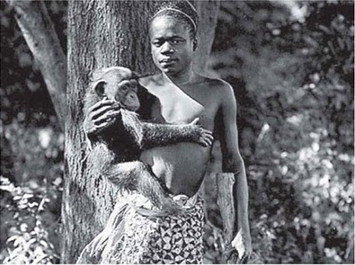 هذه صورة لأحد العبيد حاملاً قرد بيده، فقد كان يتم إيقاف العبيد إلى جانب القرود والحيوانات الرئيسية الأخرى لتبين مدى التشابه بينها!